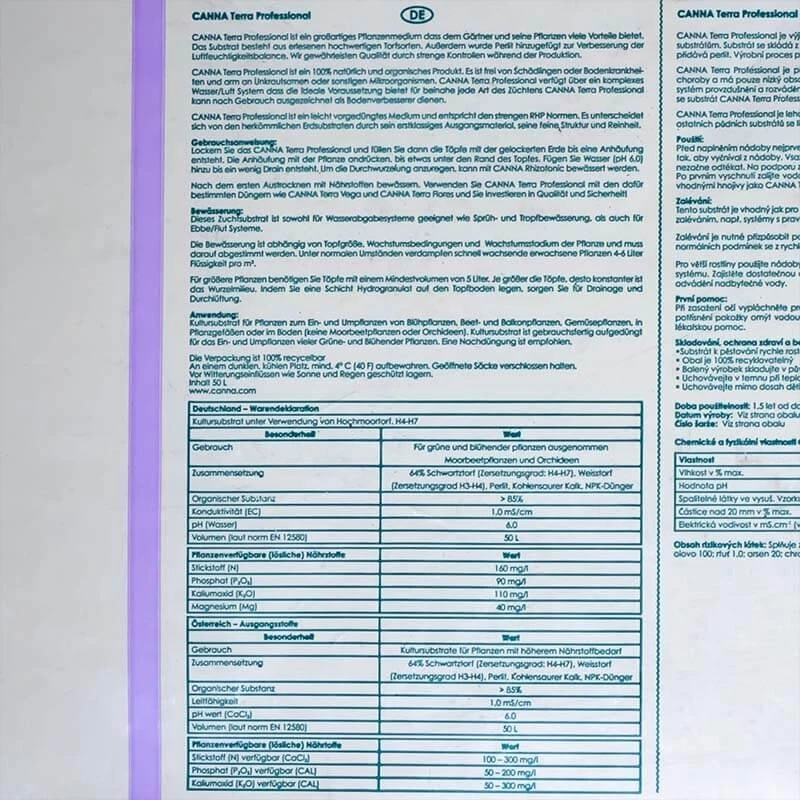 Durch die homogene, luftige Struktur des Substrats ist kräftiges Wachstum deiner Pflanzen möglich. Durch die spezielle Zusammensetzung von Canna Terra Professional wird ein optimales Luft-Wasser-Verhältnis im Substrat erzielt. Die Erde ist für die Aussaat (ca. 1 Woche) vorgedüngt, so dass nach dem Auftreten der Hauptblätter direkt mit dem bekannten Canna Düngeschema begonnen werden kann.
