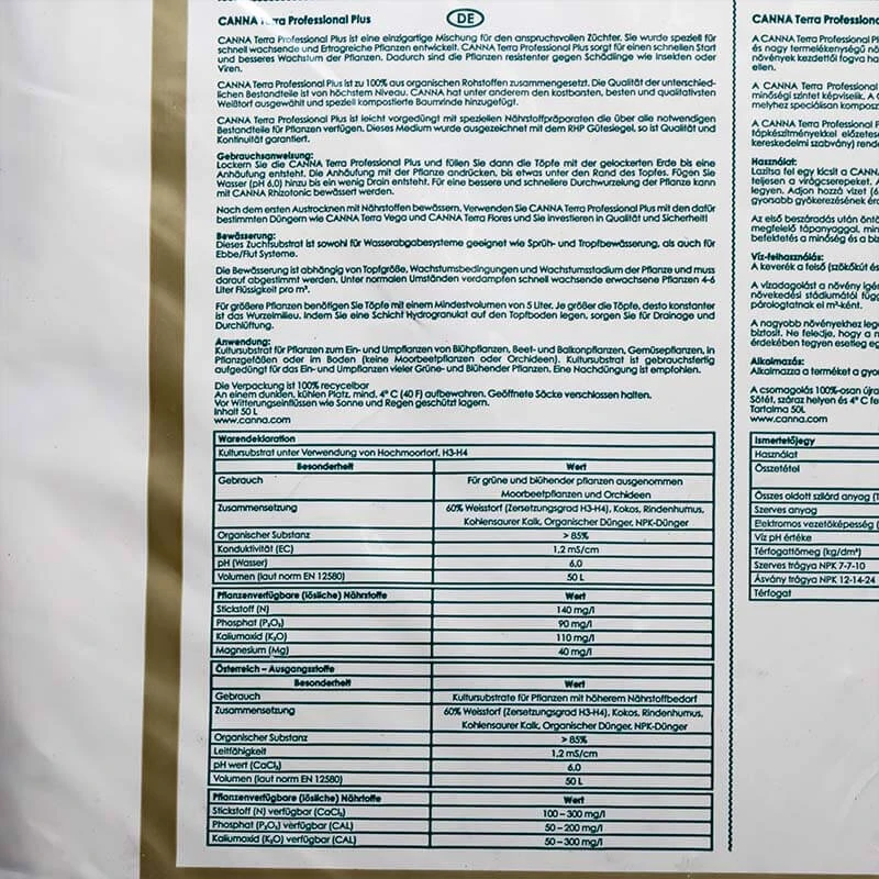 Der in Canna Terra Professional Plus Erde enthaltene Weißtorf behält sein Volumen für eine lange Zeit, wodurch eine optimale Wasserversorgung ermöglicht wird. Durch die Zugabe von Kalk ist Canna Terra Professional Plus besonders pH-Wert stabil. Für bestmögliche Ergebnisse sollte Canna Terra Professional Plus in Kombination mit Canna Dünger, wie z. B. dem Canna Terra Starterkit, verwendet werden.