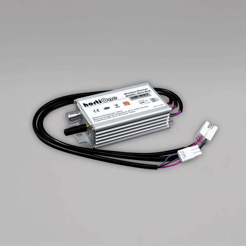 Der hortiONE V3 Knob & Bluetooth Dimmer kann die Leistung von bis zu 3 angeschlossenen LED-Treibern steuern. Der hortiONE Dimmer kann über den verbauten Drehregler in 6 Stufen oder per Bluetooth gesteuert werden. Zur Steuerung per Bluetooth wird die kostenlose Tuya Smart App verwendet. Dazu kann ein Handy ohne Internetverbindung verwendet werden. Auch Smart Home Features und die Verknüpfung mit Google Smart Home oder Amazon Alexa sind mit der Tuya Smart App möglich. Wenn der Dimmer über den Drehknopf bedient wird, ist das Bluetooth-Modul nicht aktiv. Die für die Verbindung mit hortiONE V3 LEDs nötigen Kabel sind bereits im Lieferumfang enthalten.