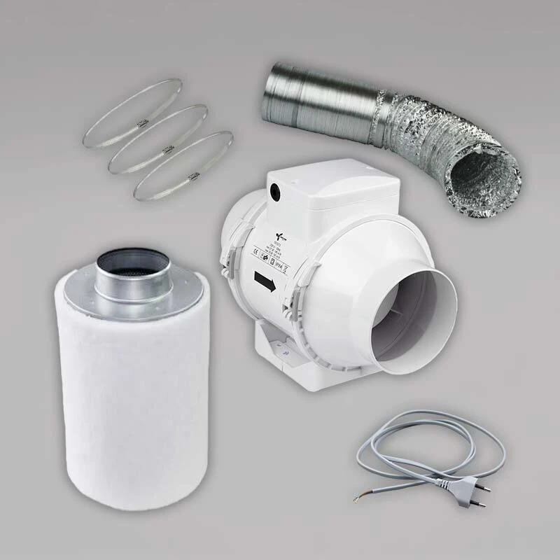 Das Abluftset erfüllt zwei wichtige Aufgaben. Neben der Frischluftversorgung der Pflanzen verhindert der Aktivkohlefilter ein Austreten von unangenehmen Gerüchen. Aufgrund der räumlichen Limitierung durch die geringe Größe der Growbox kommt ein kompakter Caluma Aktivkohlefilter in Kombination mit einem Axiallüfter zum Einsatz.